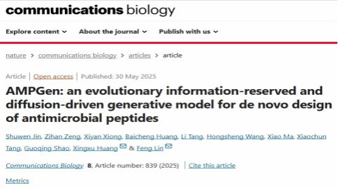 我校运载与智慧交通学院教授林峰为通讯作者的人工智能大模型团队论文“AMPGen: An Evolutionary Information-Reserved and Diffusion-Driven Generative Model for de novo Design of Antimicrobial Peptides”在 Nature 旗下期刊 Communications Biology (www.nature.com/commsbio, SCI Q1,中科院1区)发表。