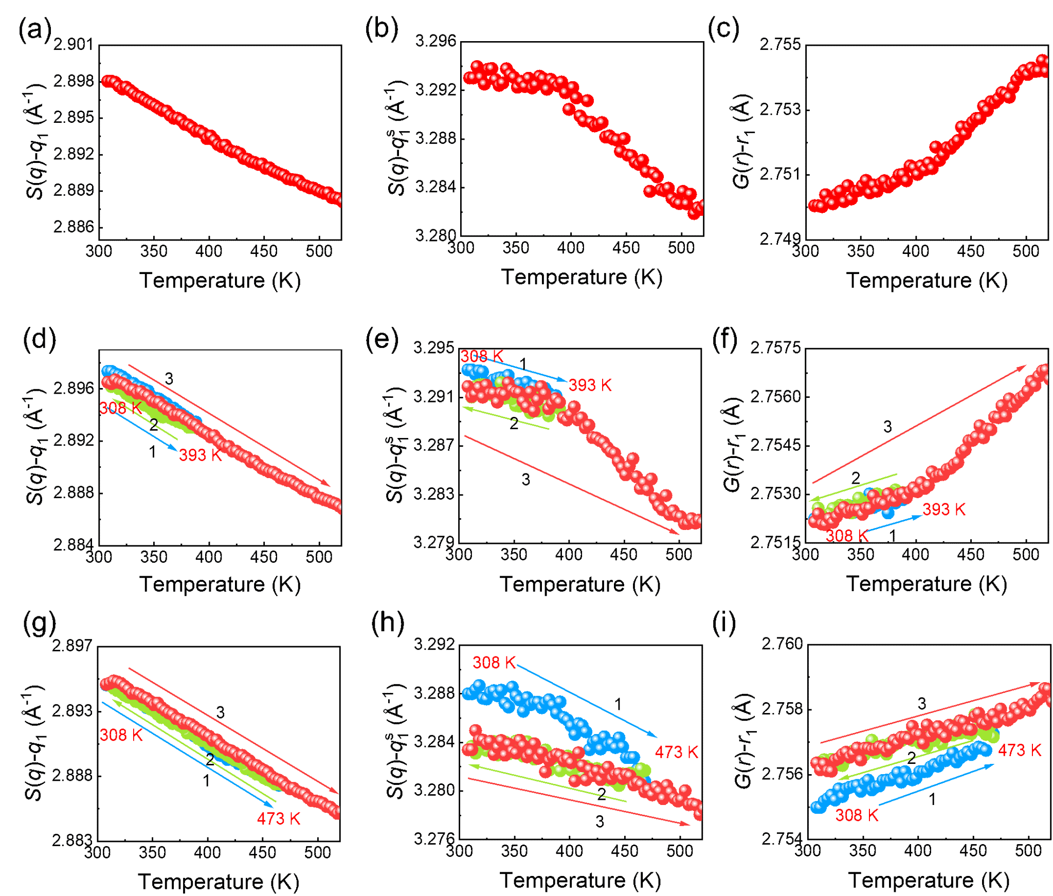 图3. 循环加热过程中的结构演化。通过HEXRD测得的S(q)主峰位置q1、肩峰位置q1s以及G(r)主峰位置r1的温度依赖性:(a)-(c) 单向连续加热至523 K;(d)-(f) 热循环过程:样品首先从308 K加热至393 K,冷却至308 K,随后重新加热至523 K;(g)-(i) 类似的热循环过程,但首次加热停止于473 K。所有步骤的升温和冷却速率均为10 K/min。