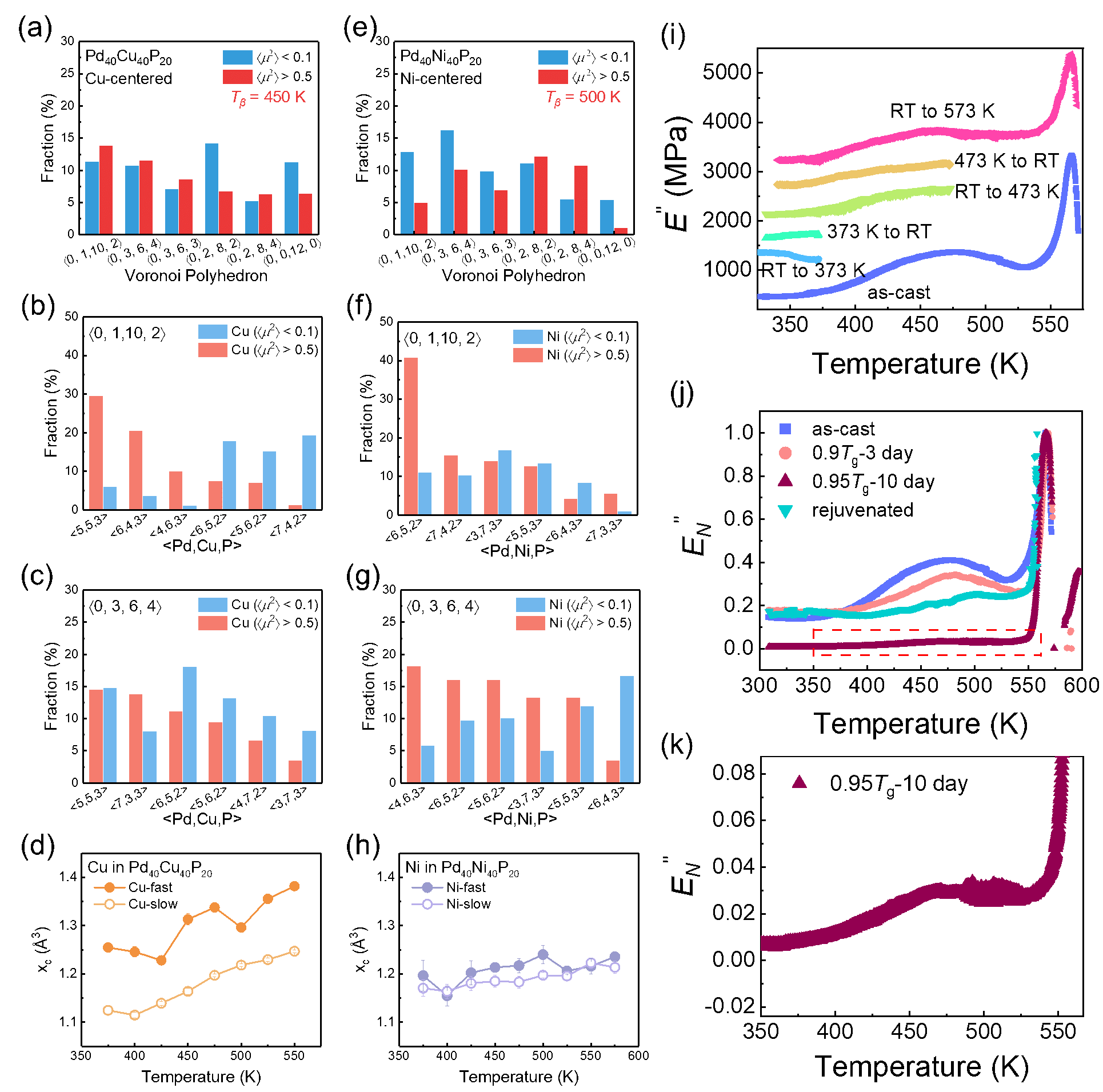 图5. Pd40Cu40P20与Pd40Ni40P20金属玻璃静态结构对比及Pd40Cu40P20循环加热过程中DMA谱演变。(a) 450 K时以Cu原子为中心的主要Voronoi多面体占比。Pd40Cu40P20中(b) á0, 1,10, 2ñ和(c) á0, 3, 6, 4ñ多面体内Cu原子的分配位数。(d) Cu原子自由体积分布峰位随温度的变化。(e) 500 K时以Ni原子为中心的主要Voronoi多面体占比。Pd₄₀Ni₄₀P₂₀中(f) á0, 1,10, 2ñ和(g) á0, 3, 6, 4ñ多面体内Ni原子的分配位数。(h) Ni原子自由体积分布峰位随温度的变化。(i) 循环加热过程中损耗模量的温度依赖性(首次加热至373 K,后续至473 K,升温速率3 K/min,频率1 Hz,RT:室温)。(j) 铸态、0.9Tg-3天退火、0.95 Tg-10天退火及再激活样品的归一化损耗模量。(k) 0.95 Tg-10天退火样品在Tg以下的损耗模量曲线放大图。