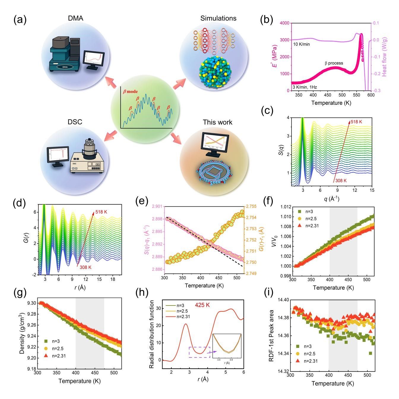 图1. Pd40Cu40P20金属玻璃的DMA/DSC图谱及其相关b-弛豫的分析,同时展示了在不同n值下体积、密度、径向分布函数和配位数的热演化行为。(a) 过去25年来研究玻璃材料中b-弛豫的主要方法(浅蓝色区域),以及本工作提出的基于同步辐射的结构表征方法(米色区域)。DMA:动态力学分析;DSC:差示扫描量热法;MD:分子动力学模拟。(b) DMA损耗模量与DSC热流的温度依赖性关系。(c) 通过高能X射线衍射在10 K/min升温速率下测得的静态结构因子S(q)和(d) 对分布函数G(r)。(e) 升温过程中S(q)的主峰位置q1与G(r)的相应主峰位置r1的温度依赖性变化。(f) 在n分别等于3、2.5和2.31时,归一化体积随温度升高的演化情况。(g) 基于体积和样品室温密度计算得出的不同温度下的对应密度值。(h) 从HEXRD实验中提取的在425 K时,n分别为3、2.5和2.31的径向分布函数,显示出良好的重叠性。(i) 通过对径向分布函数的第一个峰进行积分得到的最近邻配位数的温度依赖性变化。