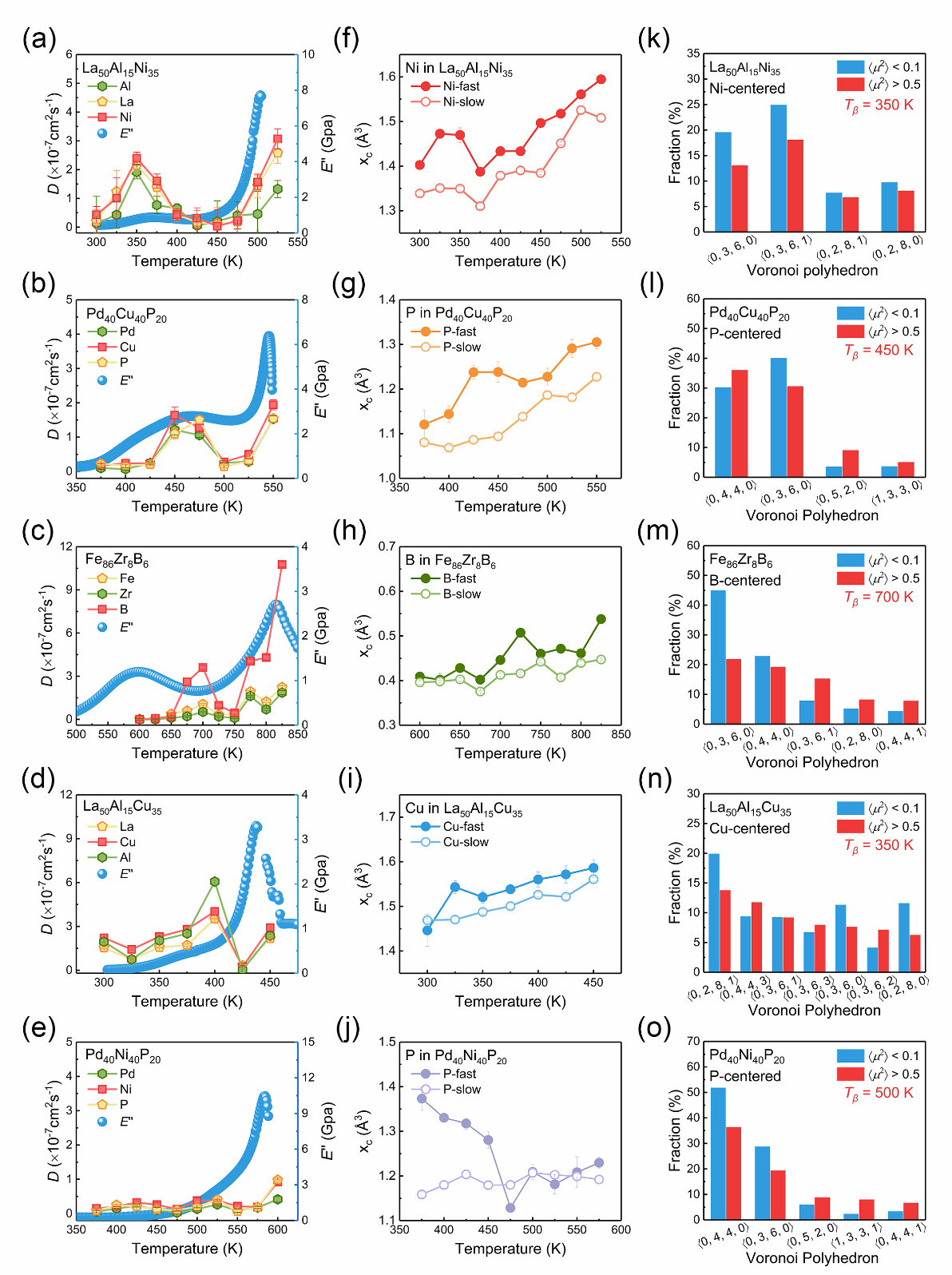 图4. 原子扩散能力与静态结构的第一性原理计算。(a)-(e) 自扩散系数与损耗模量之间的关系。误差棒表示MSD曲线拟合斜率的标准误差。(f)-(j) 自由体积分布的拟合峰位。误差棒表示Gumbel拟合中峰位的标准误差。(k)-(o) 在各自b-弛豫温度下,以最小原子为中心的主要Voronoi多面体占比情况(快原子áμ2ñ > 0.5 Å2,慢原子áμ2ñ < 0.1 Å2),研究对象包括La50Al15Ni35、Pd40Cu40P20、Fe86Zr8B6、La50Al15Cu35和Pd40Ni40P20金属玻璃。