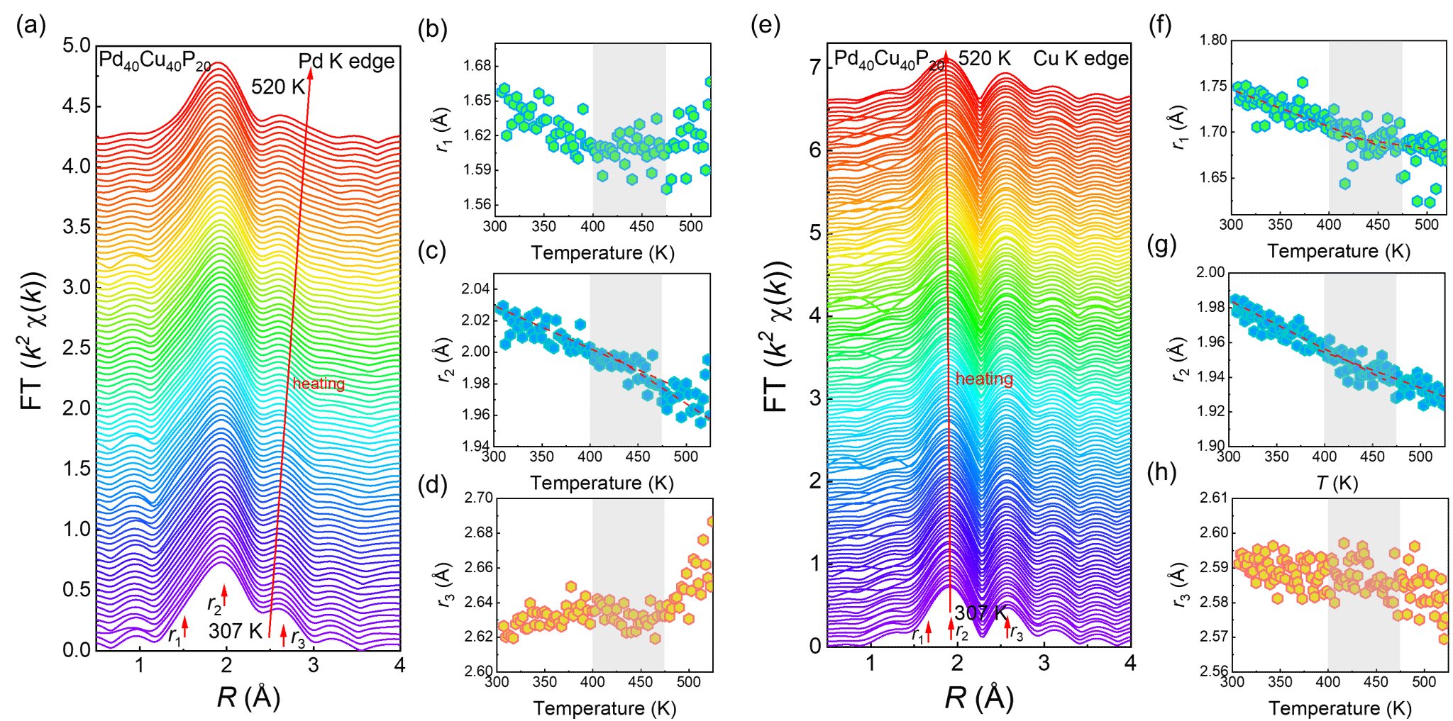 图2. Pd和Cu的K边原位高温XAFS谱峰演化。(a) Pd的K边XAFS谱(未经相移校正的R空间谱图)。(b-d) 从Pd的K边R空间谱图导出的第一峰位置r1、第二峰位置r2和第三峰位置r3的温度依赖性演化。(e) Cu的K边XAFS谱(未经相移校正的R空间谱图)。(f-h) 从Cu的K边R空间谱图导出的第一峰位置r1、第二峰位置r2和第三峰位置r3的温度依赖性演化。图中红色虚线为辅助视觉引导线。