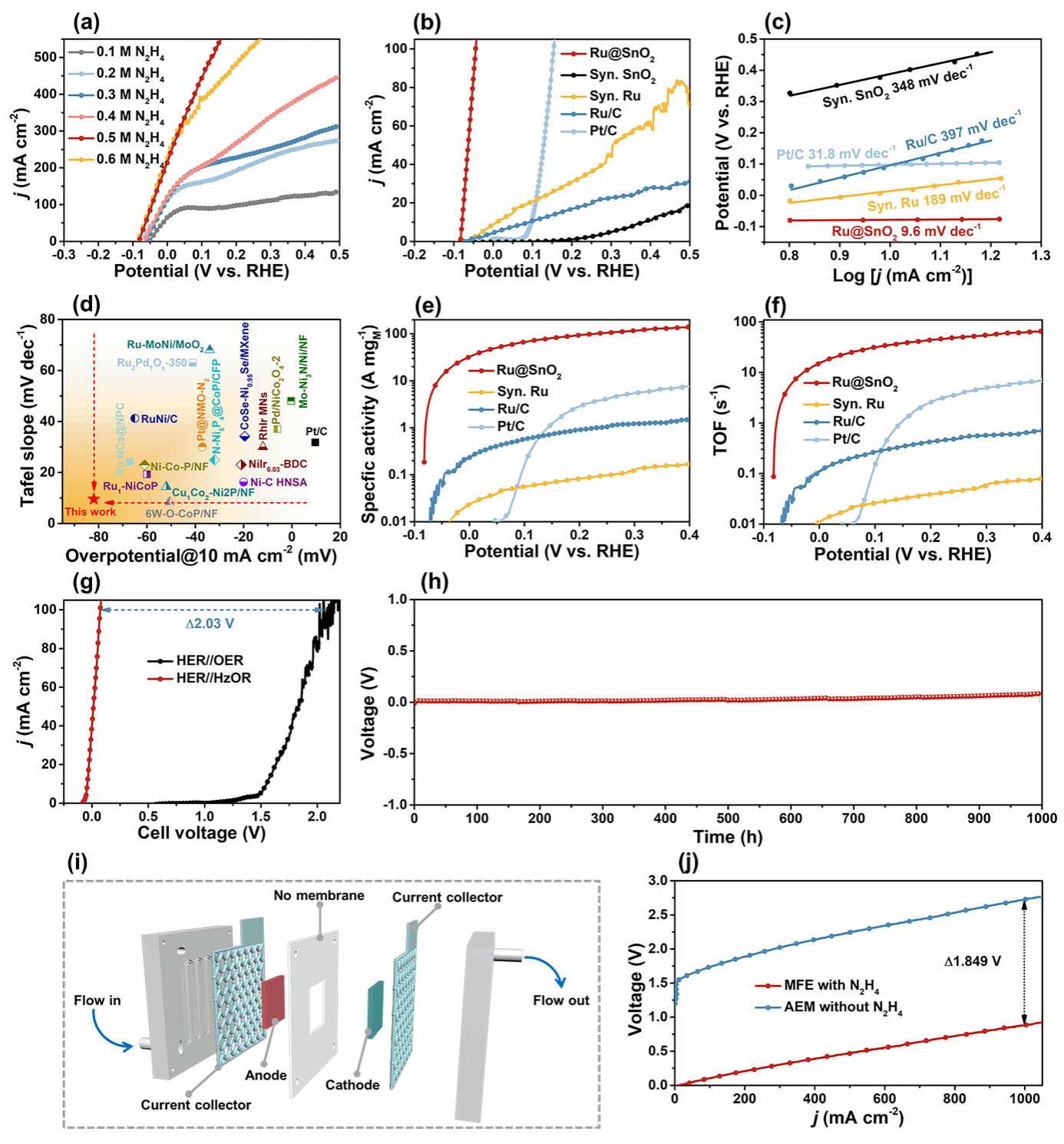 图4. Ru@SnO2的肼氧化反应性能及其在节能制氢系统中的应用。(a) Ru@SnO2在不同N2H4浓度电解液中的HzOR极化曲线,用于确定最佳反应条件。(b) 在1.0 M KOH + 0.5 M N2H4电解液中,Ru@SnO2与各参考催化剂的线性扫描伏安曲线对比。(c) 从LSV曲线推导出的相应HzOR塔菲尔斜率。(d) Ru@SnO2在10 mA cm-2下的工作电位和塔菲尔斜率与已报道HzOR催化剂的性能对比图。(e) 在0.2 V (相对于可逆氢电极) 下的质量活性和 (f) TOF值,展示了其卓越的贵金属利用率和本征活性。(g) 以Ru@SnO2同时作为阳极和阴极的双电极系统LSV曲线:HzOR辅助水分解与传统的OER辅助水分解性能对比。(h) 在50 mA cm-2电流密度下的长期HzAWS稳定性测试。(i) 基于Ru@SnO2催化剂构建的无膜电解槽系统示意图。(j) Ru@SnO2在MFE系统 (1.0 M KOH + 0.5 M N2H4) 中的全电池极化曲线,展现了其在高电流密度下的低能耗优势。