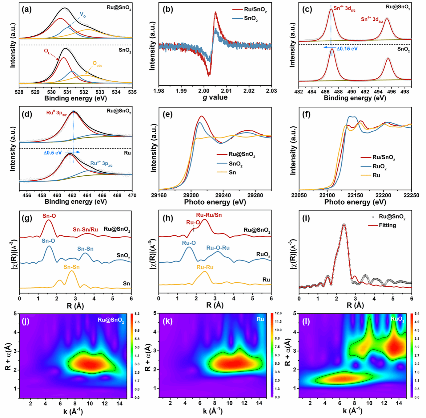图2. Ru@SnO₂的电子结构与配位环境深度解析。(a) Ru@SnO2与参考材料的O 1s X射线光电子能谱,用于分析氧物种与氧空位浓度。(b) 电子顺磁共振谱,进一步证实Ru@SnO2中具有更丰富的氧空位。(c) Sn 3d 和 (d) Ru 3p XPS谱图,显示了Sn位点电子密度增加与Ru向载体发生电子转移。(e) Sn K边与 (f) Ru K边X射线吸收近边结构谱,揭示了金属与载体间的电荷重新分布。(g) Sn K边与 (h) Ru K边扩展X射线吸收精细结构谱的傅里叶变换幅度,用于解析局域配位结构。(i) Ru@SnO2在Ru K边的R空间EXAFS拟合结果。小波变换EXAFS等高线图:(j) Ru@SnO2, (k) Ru箔, (l) SnO2,用于区分不同键合的背散射信号。