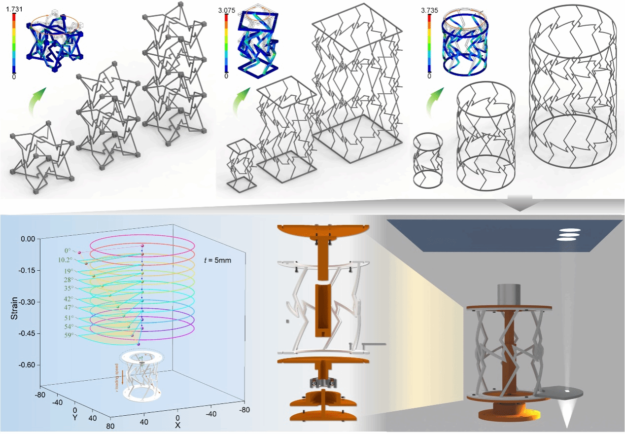 近日,智造与未来技术学院副研究员冯宁及其研究团队的最新研究成果“Twisted Metamaterials for Mechanical Optical Switch”被Nature index 杂志Applied Physics Letters接收。该研究中单层薄壁圆管结构实现了高达59.5°的显著扭曲角度,展示了超越以往研究成果的压缩-扭转耦合效应,并为压扭结构存储、传递信息,以及通过光学成像手段表达提供了新方法。
