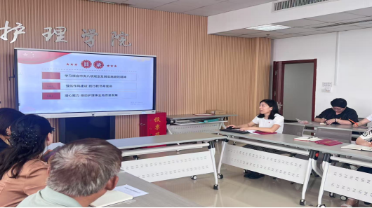 随后,教工党支部书记刘婷做了“筑牢信仰之根基,践行教书育人使命”的专题党课。她在讲授中首先解读了中央八项规定及其实施细则精神,继而结合高校教师教书育人的本职工作,强调了党员同志要坚定理想信念,在教学、科研、管理等日常工作中贯彻中央八项规定精神,加强党性修养,以立德树人为根本任务,爱岗敬业,关爱学生,以身作则,成为学生思想和行为的引领者,在教学中坚定政治立场,传播正能量,在科研中坚持正确的政治方向,紧密围绕服务健康中国建设的国家战略,开展具有前瞻性和应用价值的研究工作,为国家的医疗卫生事业贡献智慧和力量。同时,着重阐述了进一步强化作风建设、开展学习教育的重要意义,勉励党员教师以高度的责任心和敬业精神投入到教书育人工作中,并以人工智能辅助教学为例分享了护理学专业课程改革的文献,将中央八项规定中倡导的务实作风运用到教育教学工作中,脚踏实地,真抓实干,不断提高教育质量。