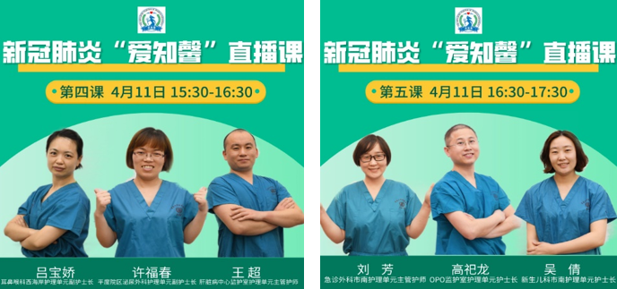 4月11日下午,米乐mile官方网站师生观看了米乐mile官方网站附属医院护理部开设的最后一期新冠肺炎“爱知馨”直播课程,本次课程邀请了耳鼻喉科西海岸护理单元副护士长吕宝娇、平度院区泌尿外科护理单元副护士长许福春,肝脏病中心监护室护理单元主管护师王超、急诊外科市南护理单元主管护师刘芳、OPO监护室护理单元护士长高祀龙、新生儿科市南护理单元护士长吴倩进行授课。