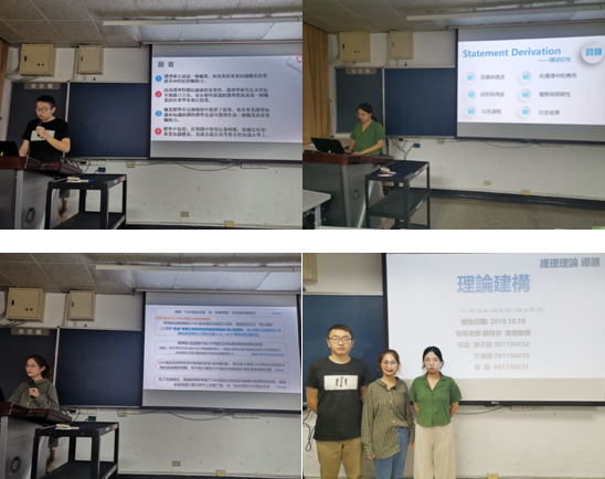 来台两周,我们了解到班级里的同学皆为在职研究生,分属于资讯组、NP组和老人组,期待日后与他们更深刻的学习交流。同时,也感受到与大陆迥异的教学方式与轻松开放的课堂氛围,亦师亦友的课堂互动,理论与实践应用的务实结合,我们每一堂课都参与其中。