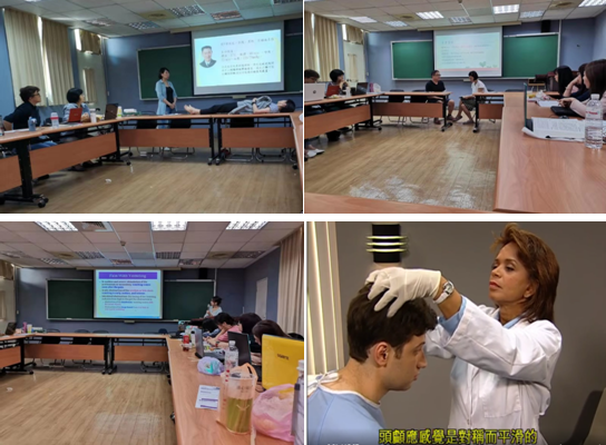 健康评估及实作课程以NP组两位同学的“ROLE PLAY”演示为开始,实景模拟NP与患者的评估、诊断过程,引导我们思考判断。老师对同学的演示做出评价与指导之后,开始课本内容讲解,最后以播放“Mosby的体检指南”视频为结束。三次课程分别讲解了“头痛、下背痛、失智症”等疾病的评估要点。