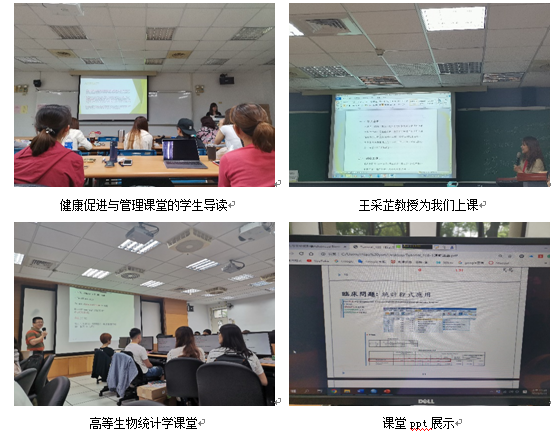 本学期,我们共选修了高等生物统计学、护理理论、健康促进与管理及健康评估与实作四门课程。台北护理健康大学的研究生课程的设置,更注重于培养学生的自我学习能力、表达能力与小组合作能力。譬如,在第一节健康促进与管理的课堂上,学生们围绕设定的参考文献,结合艾瑞克森的心理社会发展阶段理论,轮流汇报有关青少年对性行为及婚姻的看法,进行文献导读。并且,日后的每一次课,都会有同学负责一个主题的文献导读,既能锻炼学生的文献阅读能力,同时,也能让其他同学迅速对文献内容有比较细致的把握。高等生物统计学的课堂上,老师会要求学生自带电脑进行SPSS软件的即时练习,在讲授的同时将技能传授到课堂上的每一个人。王采芷教授为我们上健康评估与实作的课程,王老师的课件主要采用英文形式,这让我们在课堂上需要更多的专注力,不但要理解知识的内容,还要进行中英文的转换。学生还需要根据课程计划分组进行case study、role play的课堂展示。护理理论的课堂则更多的需要发挥学生的自我能动性,前期课程主要由老师进行理论部分的讲解,中期会以小组合作的形式进行理论建构等模块的学习,并将学习成果以PPT展示的形式分享,后期不但有每人六分钟的有关个人护理信念的汇报,还会以小组合作的形式进行概念应用,并将最终成果在课堂呈现出来。护理理论的授课老师了解到我们是从青岛来访的学生,特意设置了交流的环节,由我们向他们介绍大陆的教育及护理制度,由他们为我们介绍台湾的护理模式与制度,双方可以在交流中感受差异,开阔眼界。