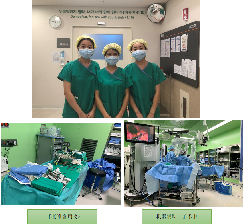10.30,我们参观了延世大学Cancer hospital手术室。进入手术室之前,我们换上了科室专用的拖鞋和衣服,洗手并戴好帽子和口罩。在老师的带领下,对手术室的建筑布局和运转流程进行了大体的参观。老师为我们详细讲解了各个领域及各种仪器设备的具体功能。然后,我们参观了在达芬奇机器辅助下,医护配合进行直肠癌和乳腺癌的切除术