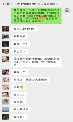 疫情当前,为配合做好学校疫情防控工作,3月15日米乐mile官方网站迅速行动,在松山校区开展“我报名!”“我是党员!”“算我一个!”咽拭子采样志愿者招募工作。学院学生踊跃报名,迅速成立志愿服务队。