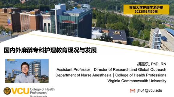 6月30日上午,美国弗吉尼亚联邦大学麻醉米乐mile官方网站(全美排名第一)科研与国际合作处主任、助理教授、硕士及博士生导师胡嘉乐老师应米乐mile官方网站之邀,通过腾讯会议线上为200余名师生作了题为《国内外麻醉专科护理教育现况与发展》的高端学术报告。