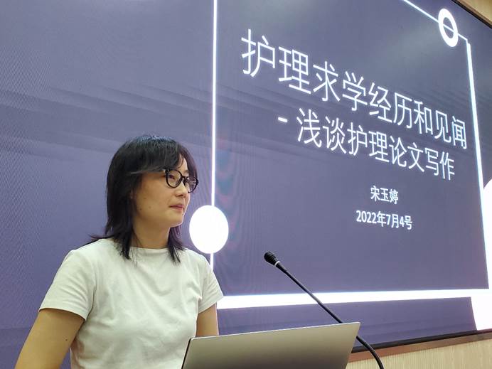宋玉婷老师上午的报告题为《护理求学经历和见闻——浅谈护理论文写作》,报告分享了自己留学期间学习和生活经历,勉励同学们勇于尝试和不断探索,尽快走出迷茫期并且做好将来的发展规划。另外宋玉婷老师也结合大量具体实例,对护理学术论文的写作、投稿等做了详细的介绍和指导。