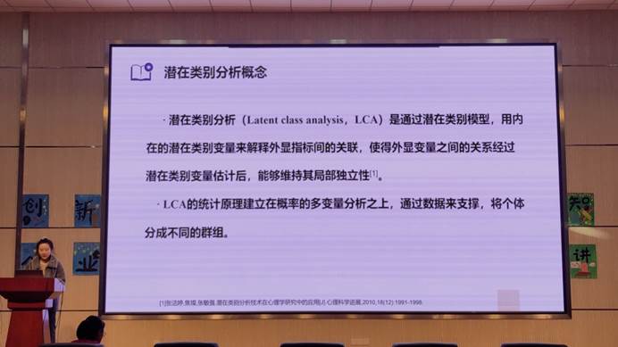 周可欣同学从“潜在类别分析的概念”、“潜在类别分析的应用”和“潜在类别分析的步骤”3个方面对潜在类别分析进行讲解,用通俗易懂的语言并结合多个案例,让大家对潜在类别分析有了初步的了解。