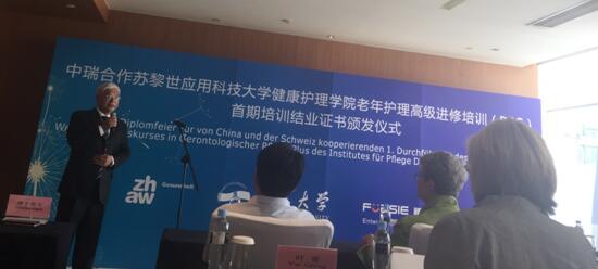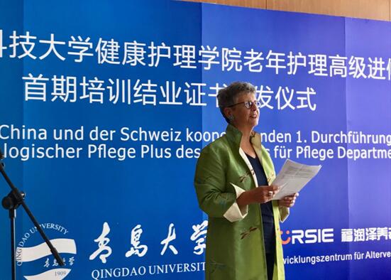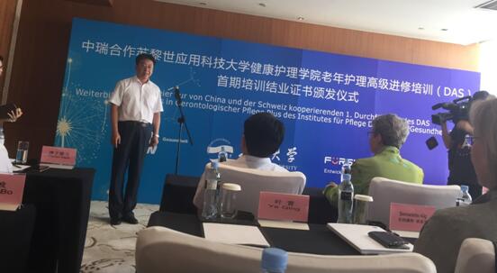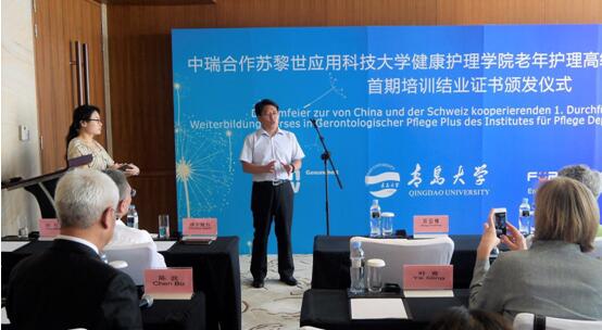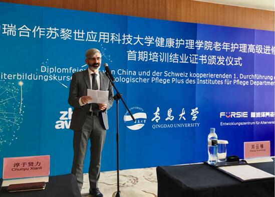 青岛市委常委、教育局局长邓云锋首先致辞,他对于米乐mile官方网站、瑞士苏黎世科技应用大学健康米乐mile官方网站和青岛福润泽养老事业发展中心开展的三方合作给予了充分肯定,表示首期中瑞养老护理高级进修培训取得圆满成功,对于应对人口老龄化的到来意义深远。